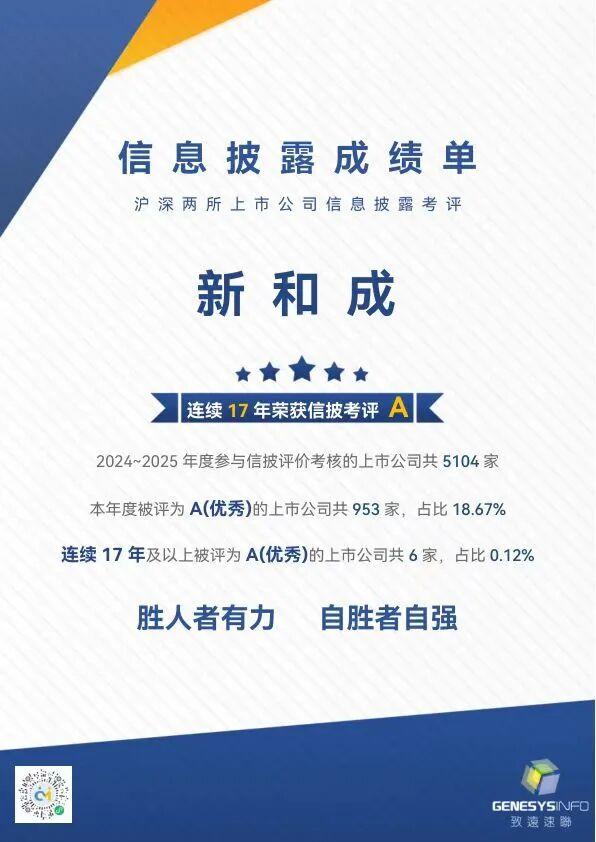 近日,深圳證券交易所公布了深市上市公司2024~2025年度信息披露考評結(jié)果,新和成以整體運作規(guī)范、高質(zhì)量的信息披露再次獲得最高評級A。目前,僅有6家上市公司連續(xù)17年獲此殊榮,占比0.12%,新和成位列其中。這一成績不僅彰顯監(jiān)管部門、市場與投資者對新和成信息披露質(zhì)量、公司治理規(guī)范的高度認(rèn)可,更是公司具備長期投資價值的有力印證。